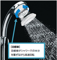 シャワー内部の羽根車がシャワー穴の半分を塞ぎながら高速回転することで、節湯と浴び心地のよい大粒化を実現しました。