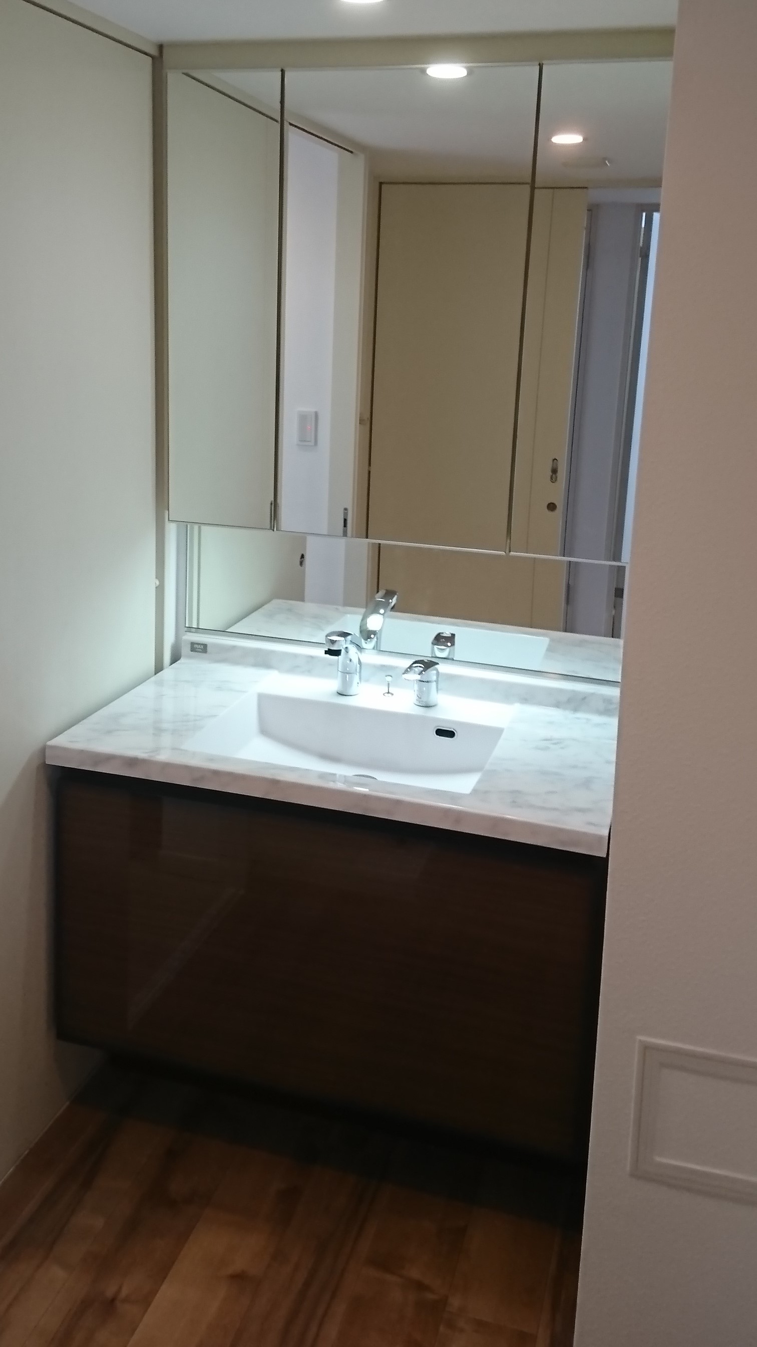 カタログをみながら、サイズとご要望にあてはまり、こちらをご提案させて頂きました。以前の洗面台と形はほぼ同じです。特徴としては多面鏡と左右からのLEDの光で顔の表情を明るく見せます。しかも明るさを調整できるが嬉しいところです。ボウル一体型なのでお掃除が楽です。鏡裏側と足元の収納がたっぷりあるので、一通り片付きます。