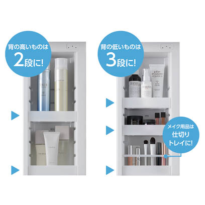 トレイアレンジは、トレイを5cm刻みで設置できるので、無駄なスペースをつくらずに高さの違うものを効率よく収納することができます。
